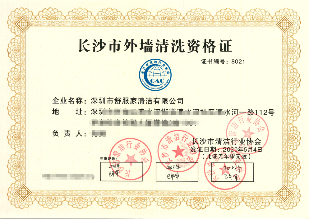 深圳市舒服家清洁有限公司获长沙市外墙清洗资格证