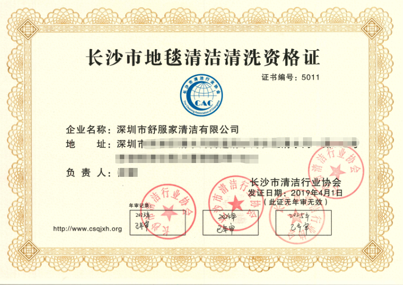 深圳市舒服家清洁有限公司获长沙市地毯清洁清洗资格证
