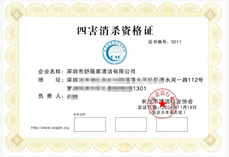 深圳市舒服家清洁有限公司获四害消杀资格证